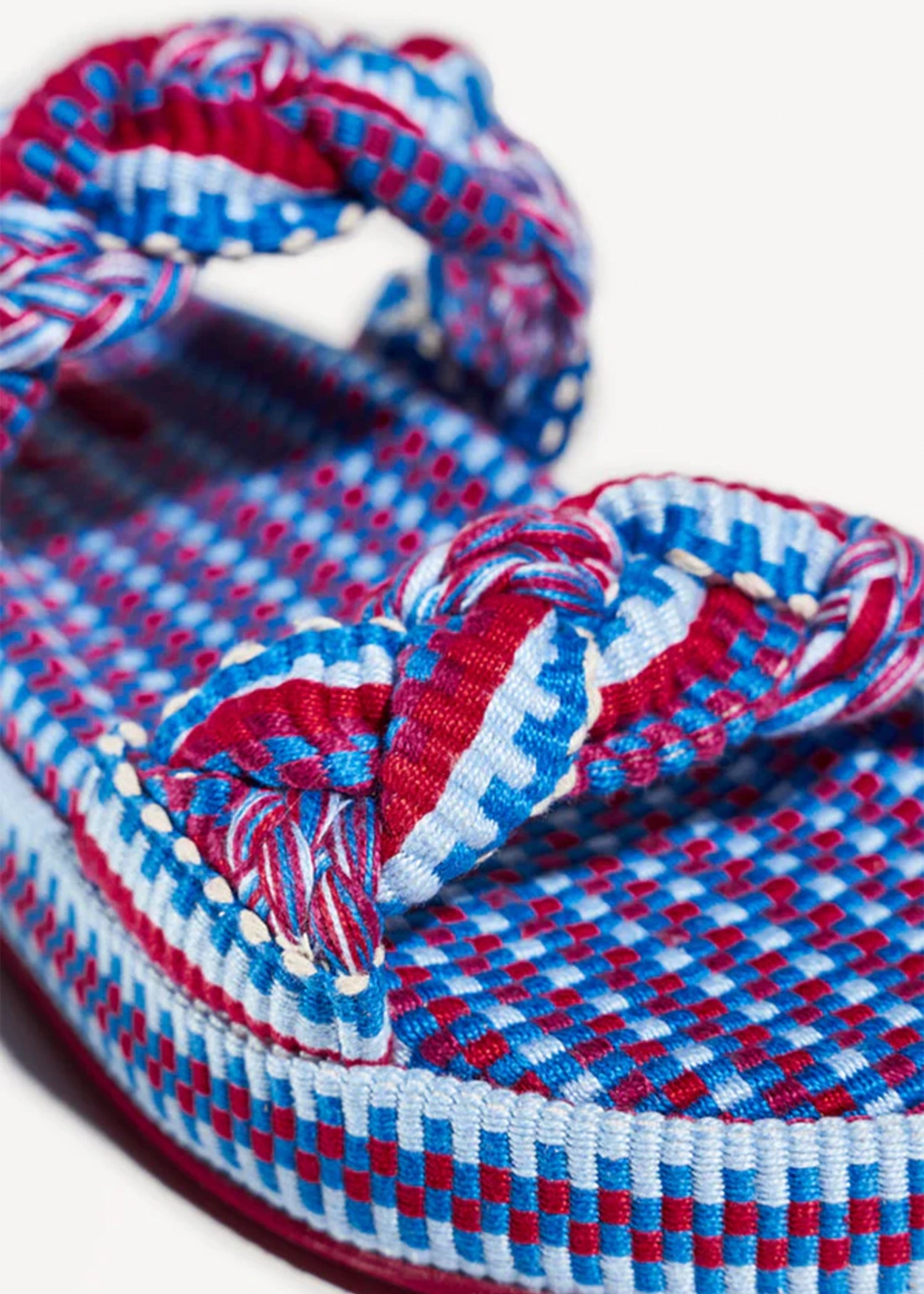 amambaih's Daniela Sandal is manufactured using braids and fabrics that are handcrafted by the artisans and the indigenous community in Paraguay. Each braid is done by hand, and the fabric is woven with the use of an artisanal loom. Due to the hand-crafted nature of the product, small irregularities or variations in the fabric and braids are not to be considered defects, but rather characteristic elements unique to each singular shoe. The Daniela Sandal features a two braided straps, a leather lining, an a natural rubber sole.